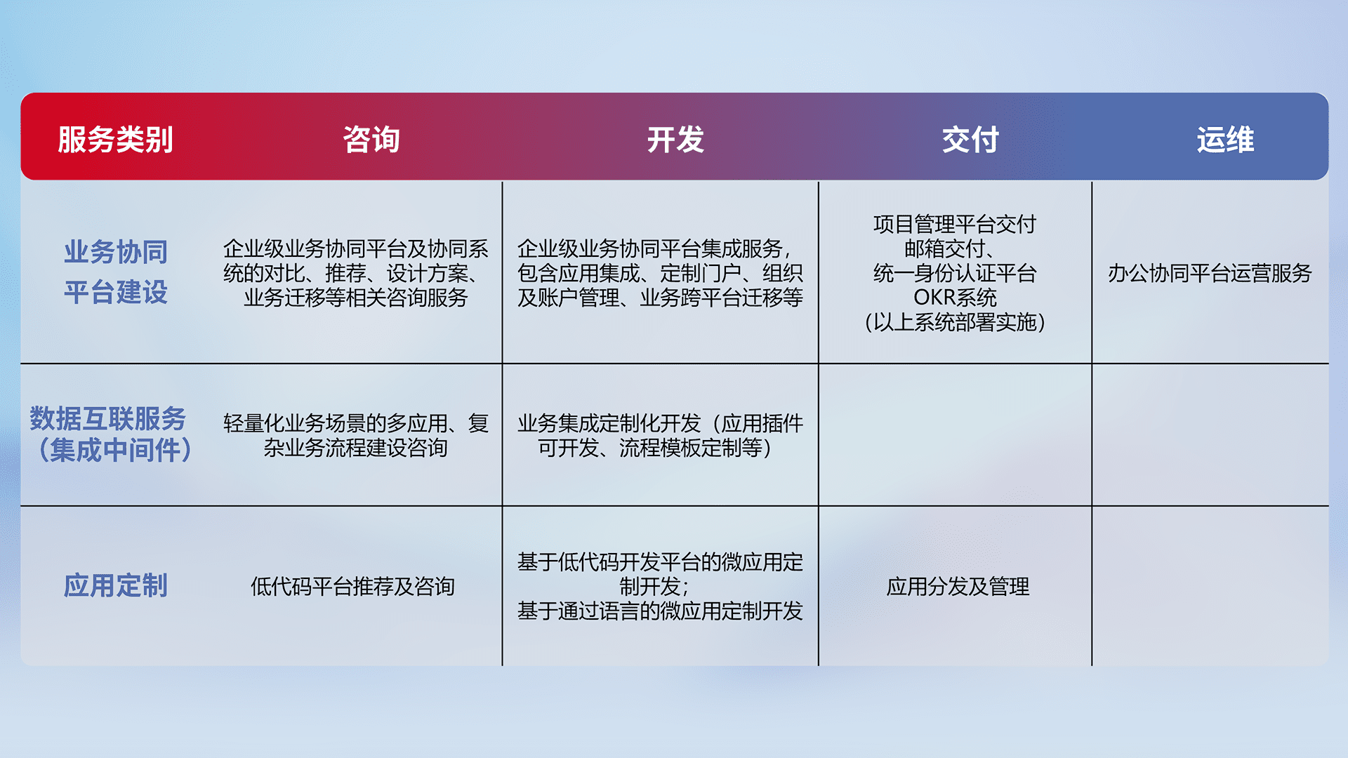 针对钉钉、、、企微、、IDaas等平台级产品提供产品的规划、、方案、、、、交付、、、、定制化开发等服务,,,实现如统一协同办公、、、、智能客户服务、、混合会议管理、、、、智能数据查询、、、等业务场景,,实现数字化转型。。。