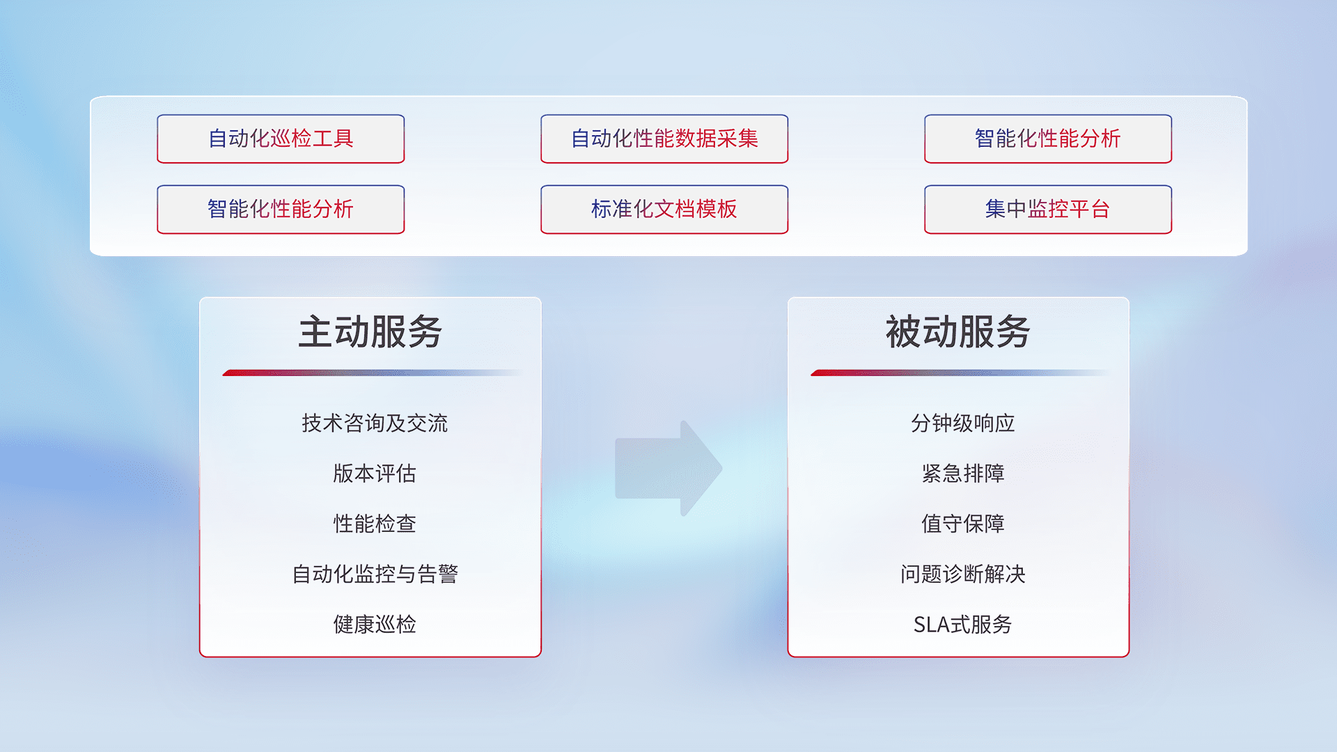 智能化工具和标准化文档,,,保障服务质量,,,,提供主动服务(包含技术咨询、、版本评估、、性能检查、、、自动化监控与告警、、健康巡检)和被动服务包含(分钟级响应、、、、紧急排障、、、值守保障、、、、问题诊断解决、、、SLA服务)。。